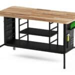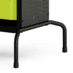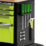 Chapa perfurada: Nas laterais da bancada, ficam as ferramentas, fixadas e organizadas através de suportes encaixados nos furos da chapa perfurada.