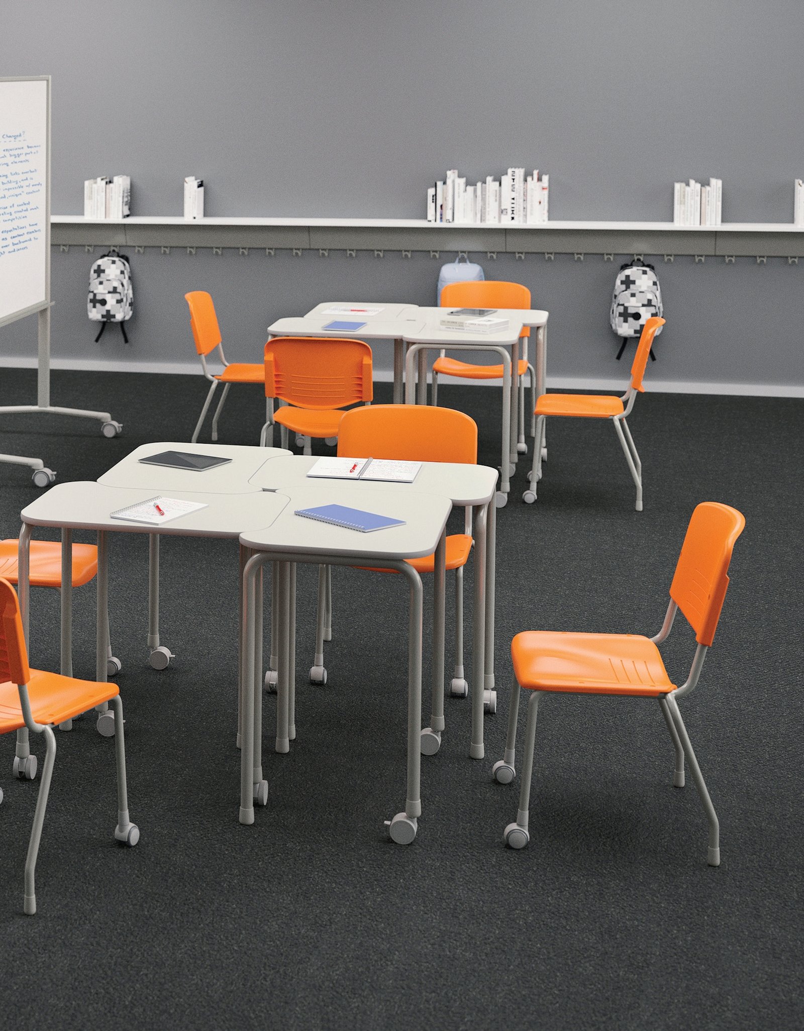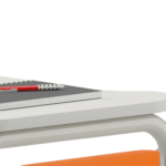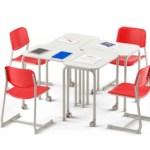 União: Quando utilizadas em grupos de quatro mesas, o formato do tampo permite a junção perfeita entre as mesas, oferecendo mais estabilidade e conforto aos alunos.