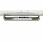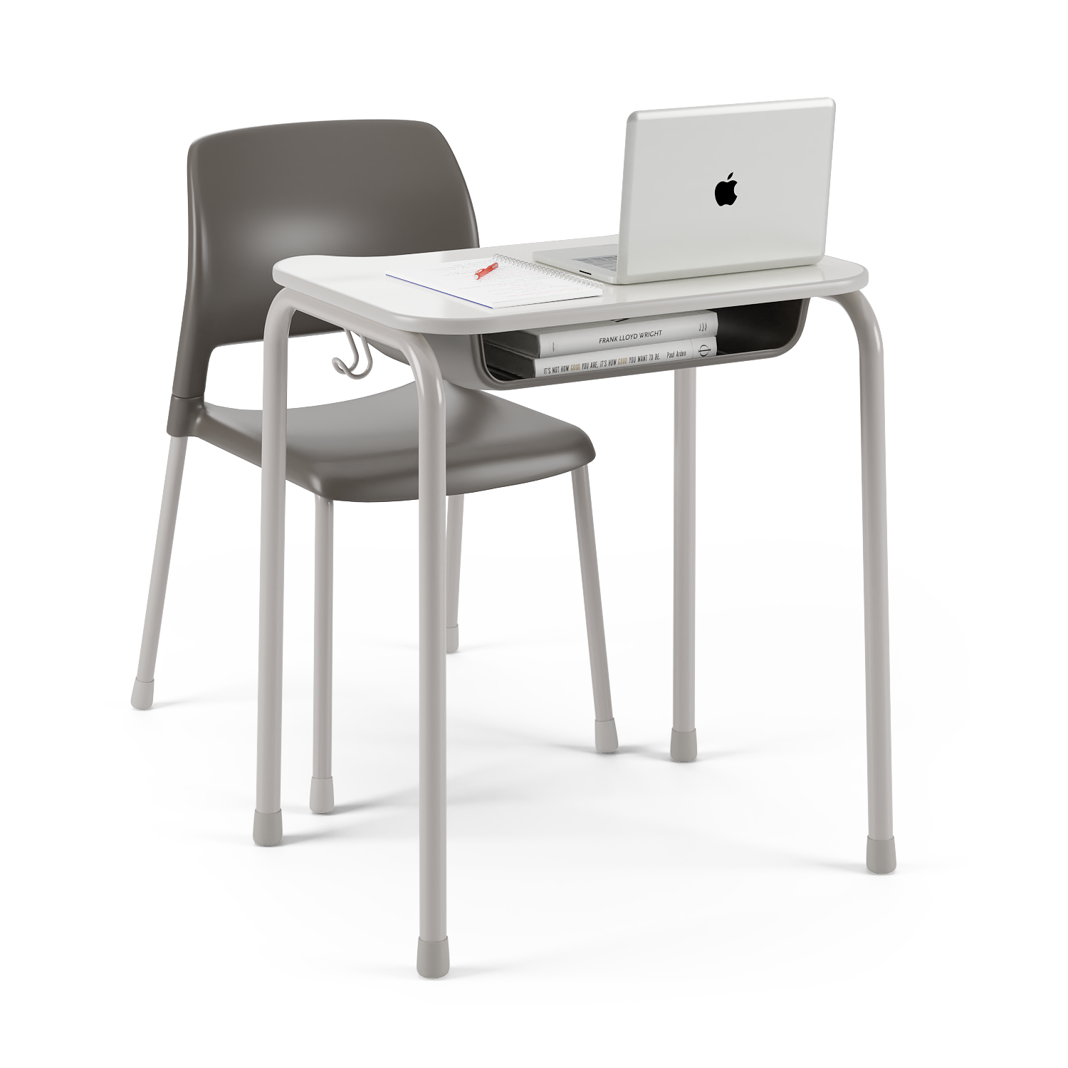 Modelo com porta-livros: Porta-livros em aço com acabamento vazado, facilitando o uso mesmo quando formado grupos de quatro mesas.